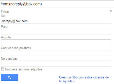 Una vez que accedas a la configuración de tu filtro, saldrá un cuadro de dialogo donde se indica automáticamente el correo del remitente que pertenece al mensaje que seleccionamos inicialmente, deja todo como esta y haz click en el enlace de la parte inferior "crear filtro con estos criterios de busqueda".