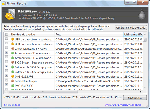Ahora lo que sigue es marcar los archivos que quieres recuperar y presiona Recuperar, luego elige la carpeta en la que se guardará el archivo recuperado. Es de suma importancia que no intentes grabar en el mismo disco del que estás recuperando los archivos, debido a que podrías estar sobrescribiendo esos mismos archivos, pudiendo volverlos corruptos.